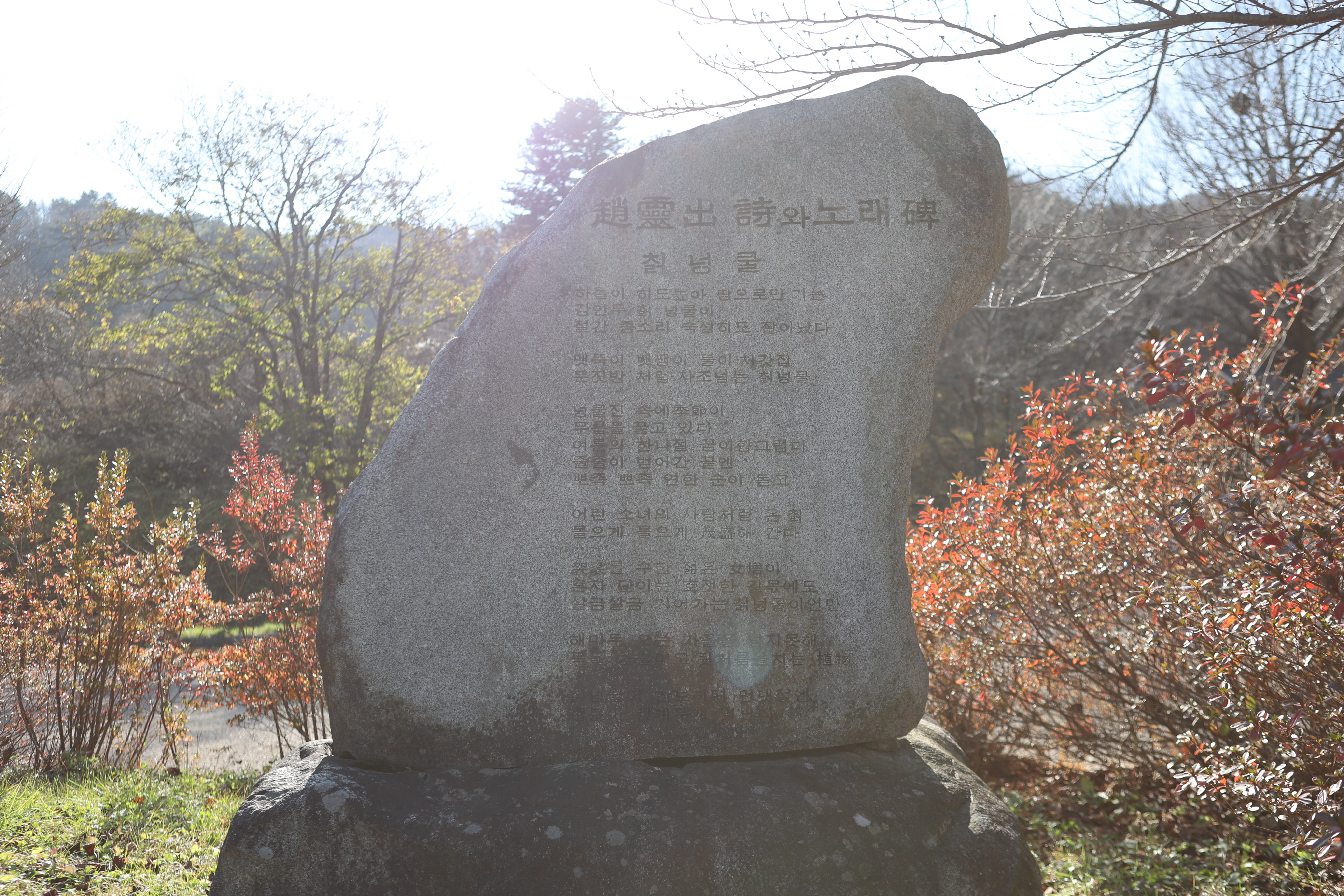 독립운동가인 한용운 시비 옆에 흥미롭게도 조영출의 '칡넝쿨' 시와 노래비가 있다. 조선인 징병까지 촉구한 친일파로 기록된 충남 아산 출신인 그는 건봉사로 출가하였다. 1948년 36세에 월북하여 김일성상 계관시인까지 지낸 조명암의 본명이 조영출이다.