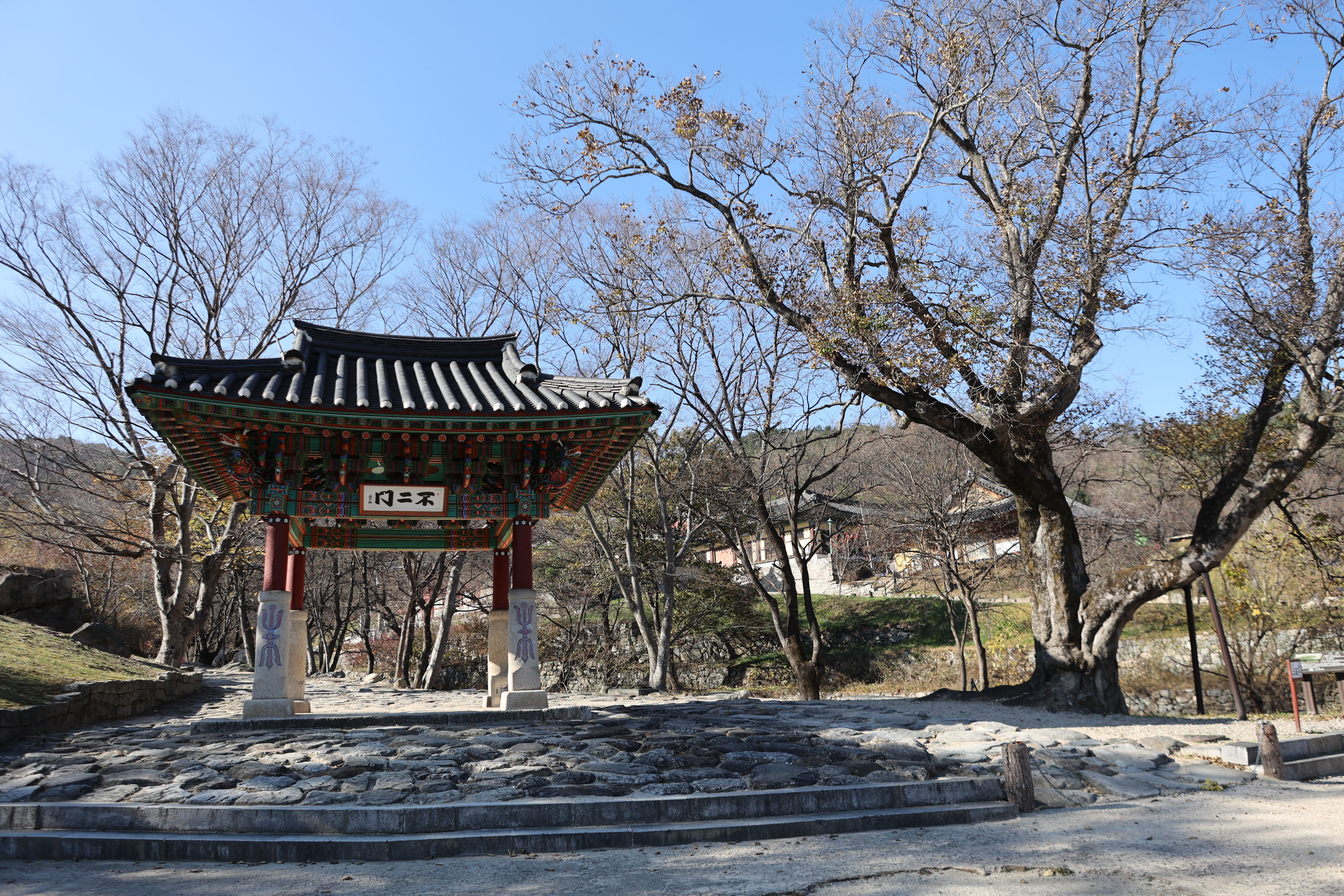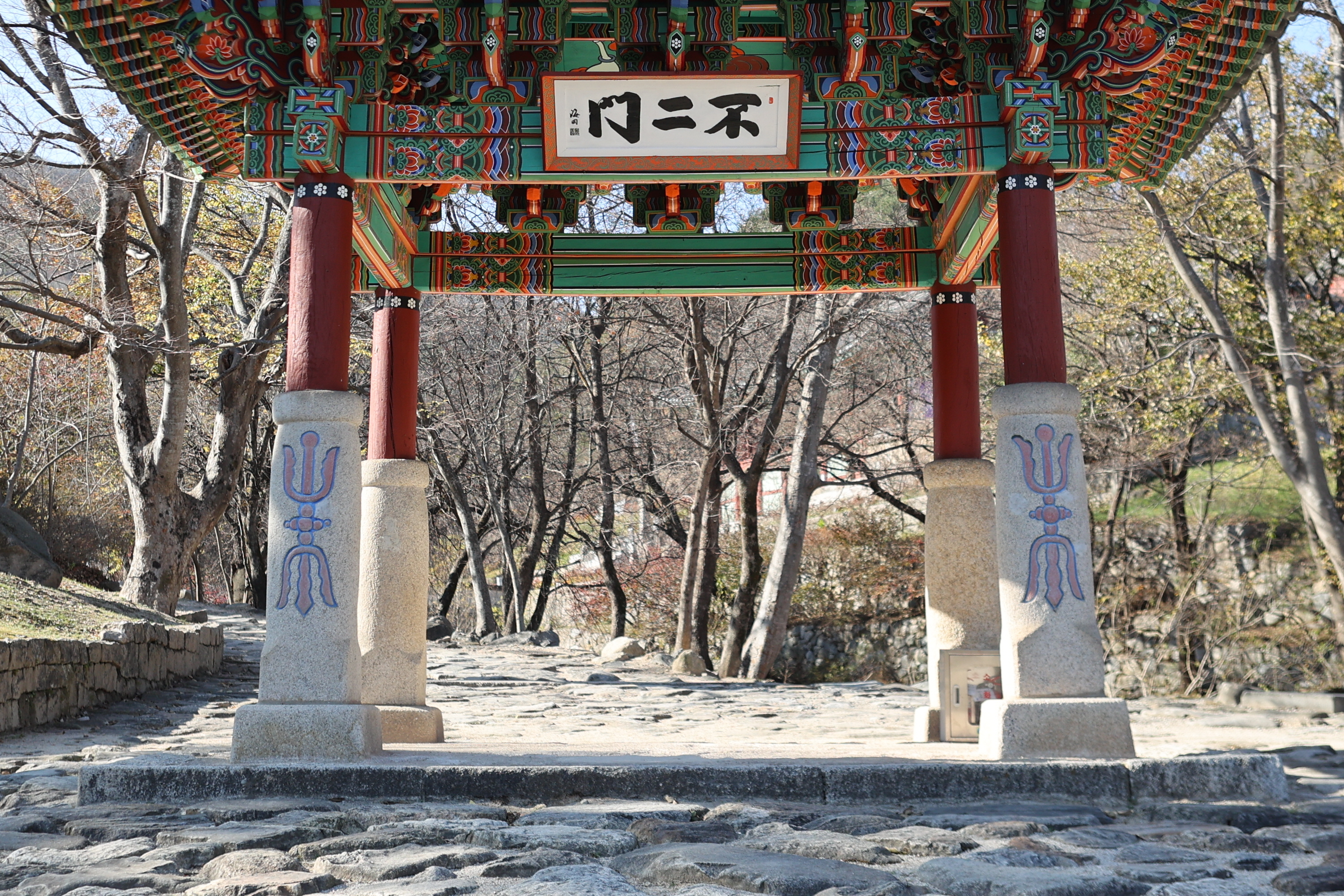 건봉사 불이문. 한국전쟁으로 모두 소실된 건봉사 터에 유일하게 남은 건축물이다. 불이란 진리는 둘이 아니라 하나라는 뜻으로 이곳을 통과해야만 진리의 세계인 불국토에 들어갈 수 있다는 뜻이다. 보통 일주문, 천왕문, 불이문 세 문을 지나는데 건봉사는 천왕문을 따로 세우지 않고 불이문 돌기둥에 금강저(金剛智杵)국립청주박물관 :: 시사랑꽃사랑 (tistory.com)를 새겨서 사찰수호의 기능까지 더하였다. 원통형으로 다듬은 4개의 돌기둥 위에 나무기둥을 세우고 지붕을 올렸다. 각 돌에 새겨진 문양은 불교의식에 사용되는 도구인 금강저를 나타낸다. 금강저는 고대 인도에서 쓰던 무기로 부처를 수호하고 번뇌를 없애는 깨달음의 지혜를 상징한다. 현판은 해강 김규진(金圭鎭)의 글씨다. 오른쪽에 수령 5백년의 팽나무 보호수가 벌써 잎을 다 떨군채 서 있다. 지정번호 강원-고성-10, 지정일자 2008년, 수고15m. 둘레2.2m의 거목인데 왕소나무와 함께 건봉사가 자랑하는 명물 중의 하나다. 건봉사는 한국전쟁시 전소되었으나 불이문만 화를 입지 않았는데 이 팽나무가 지켜주었다고 전해지고 있다. 1920년에 중수하였다.