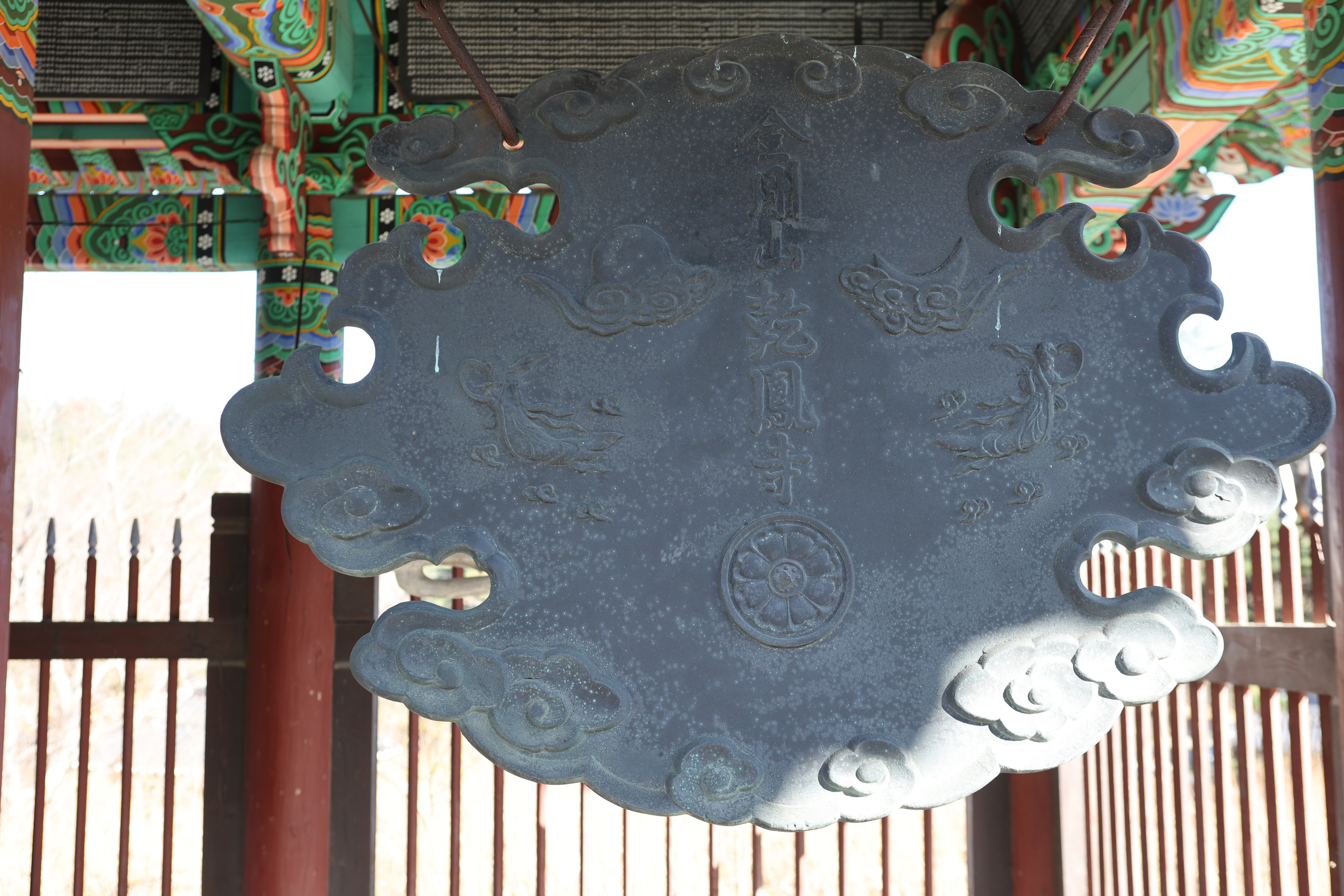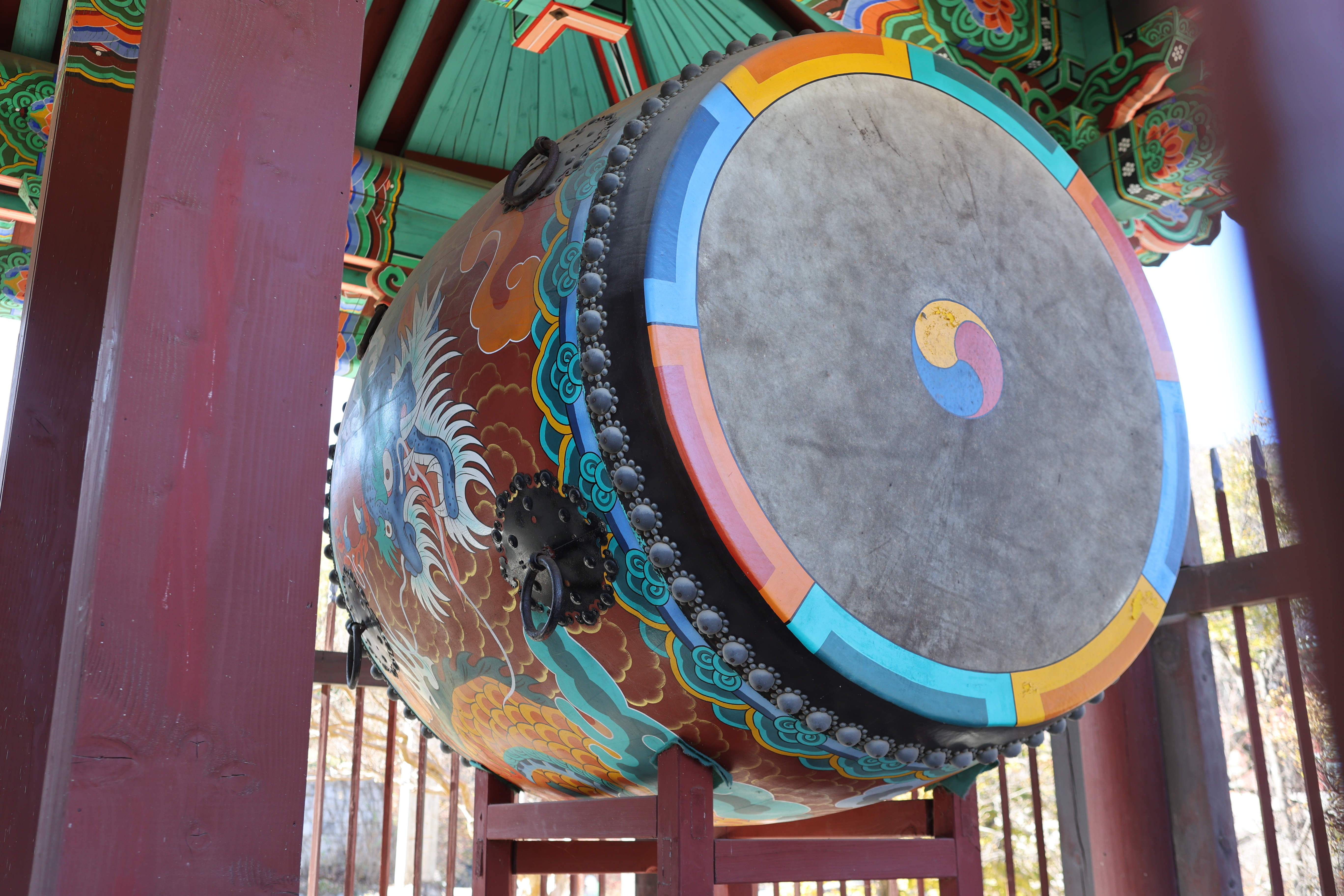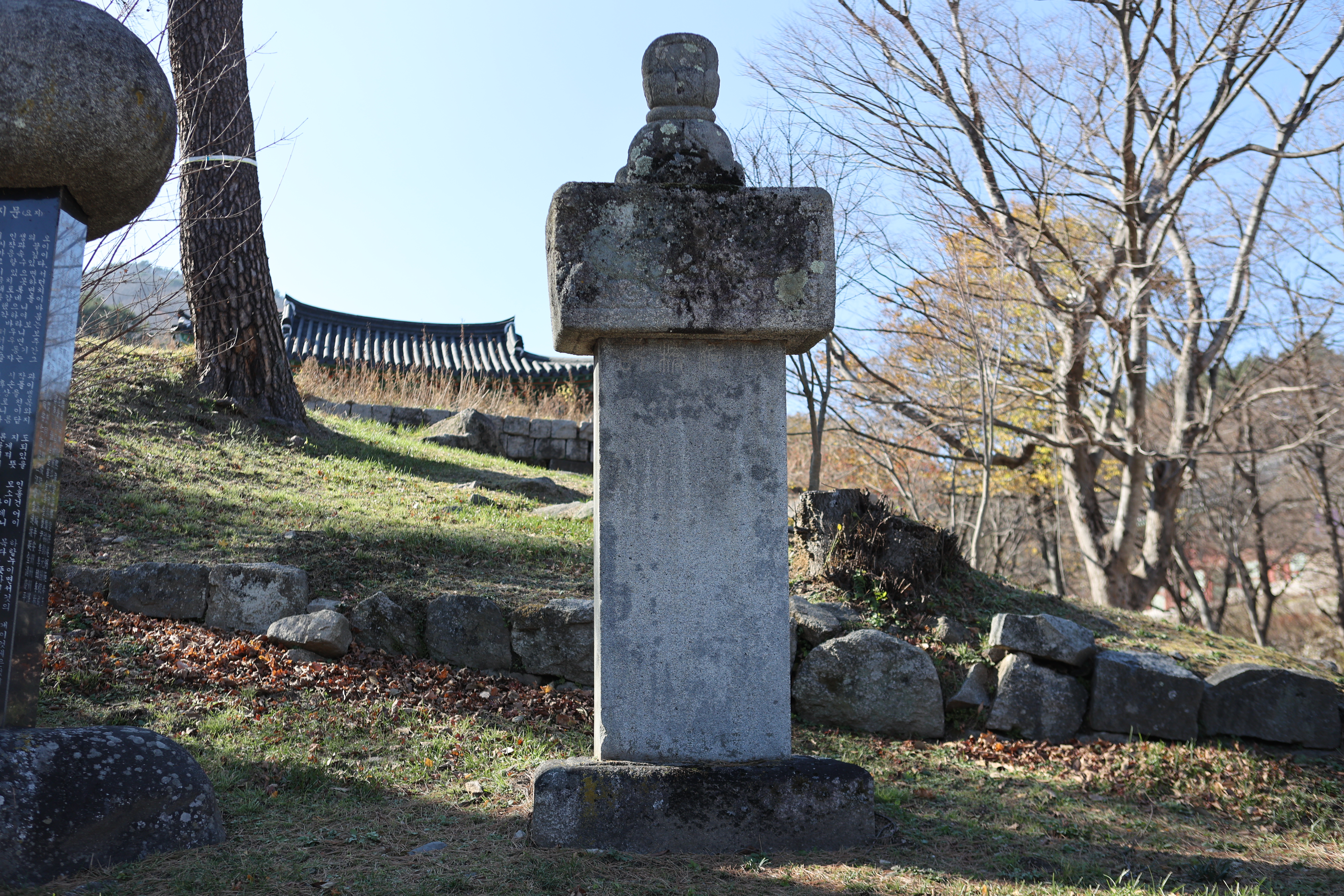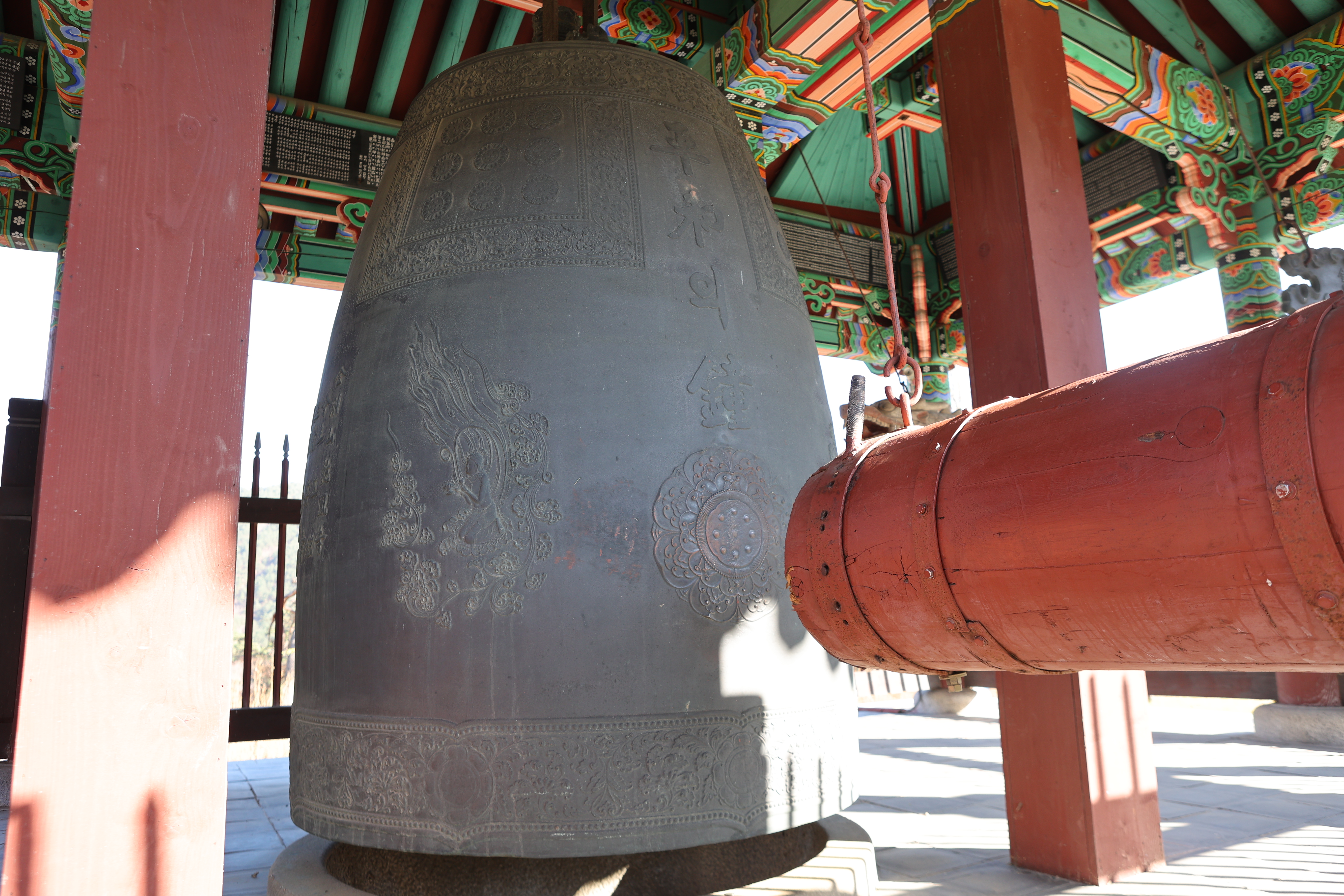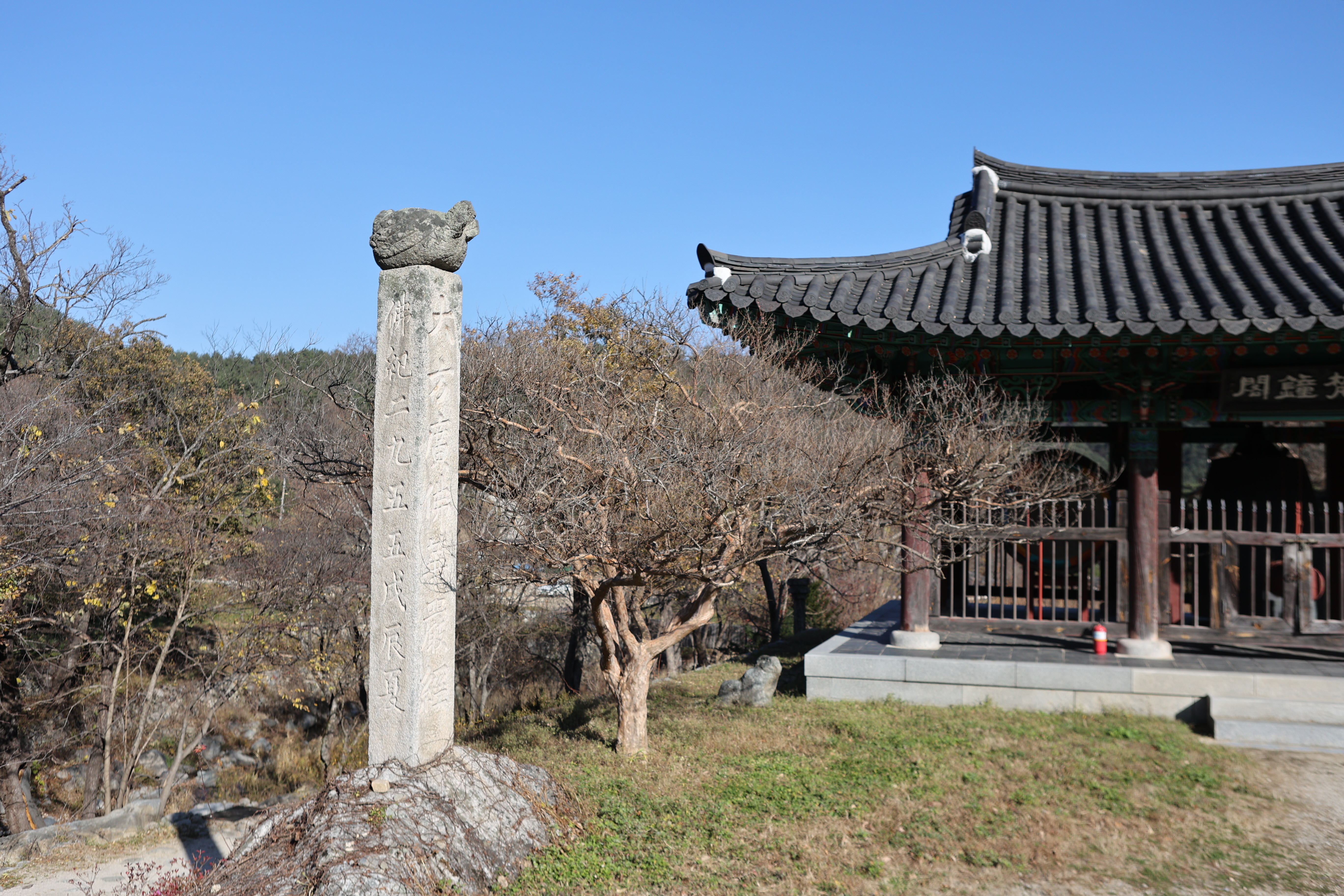 대방광불화엄경(大方廣佛華嚴經) 글자가 새겨진 석주가 서 있는 범종각. 대방광불화엄경은 화엄경의 본래 이름이며 불교천태중앙박물관에 보관된 목판본이 보물 제1017호로 지정되어 있다.