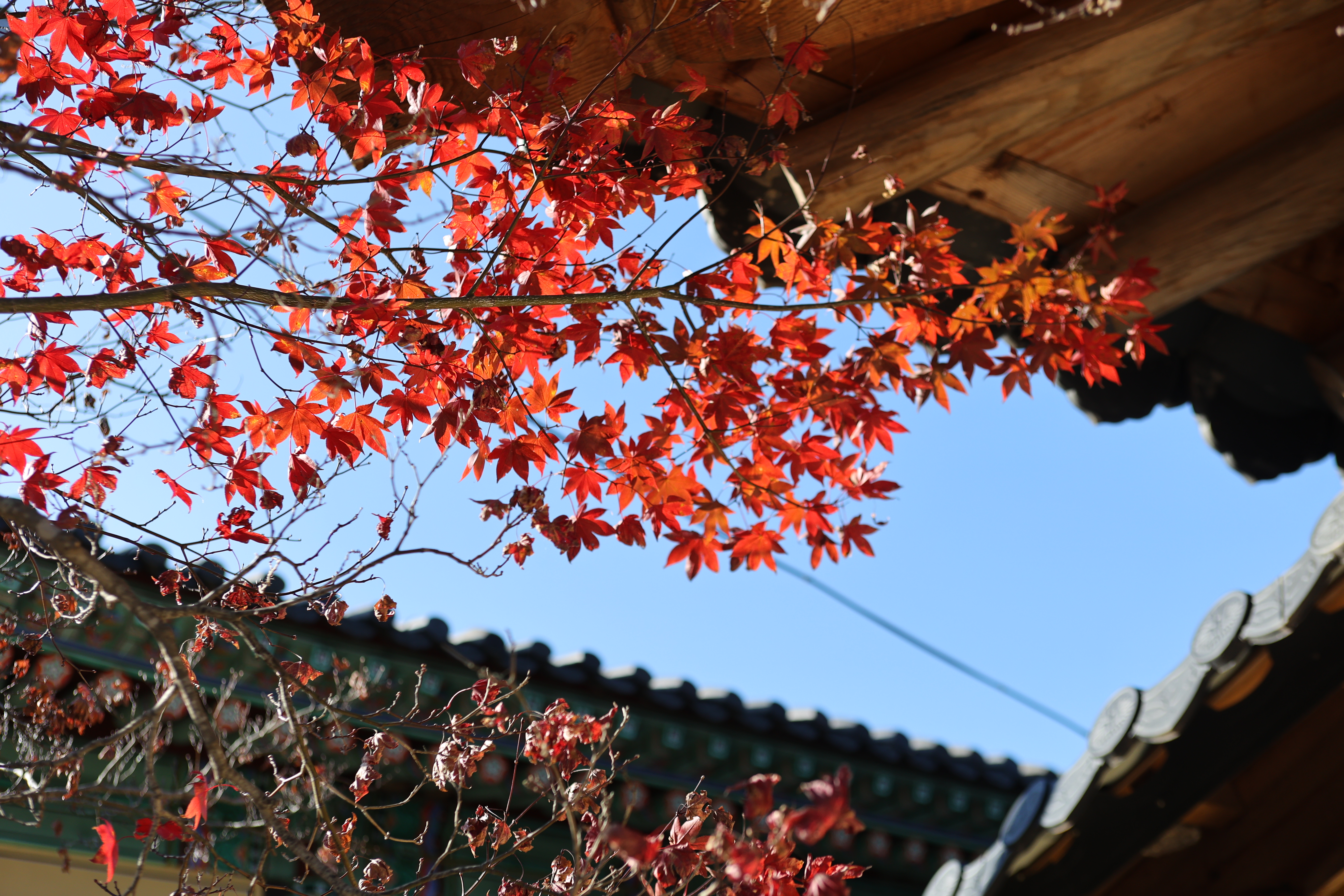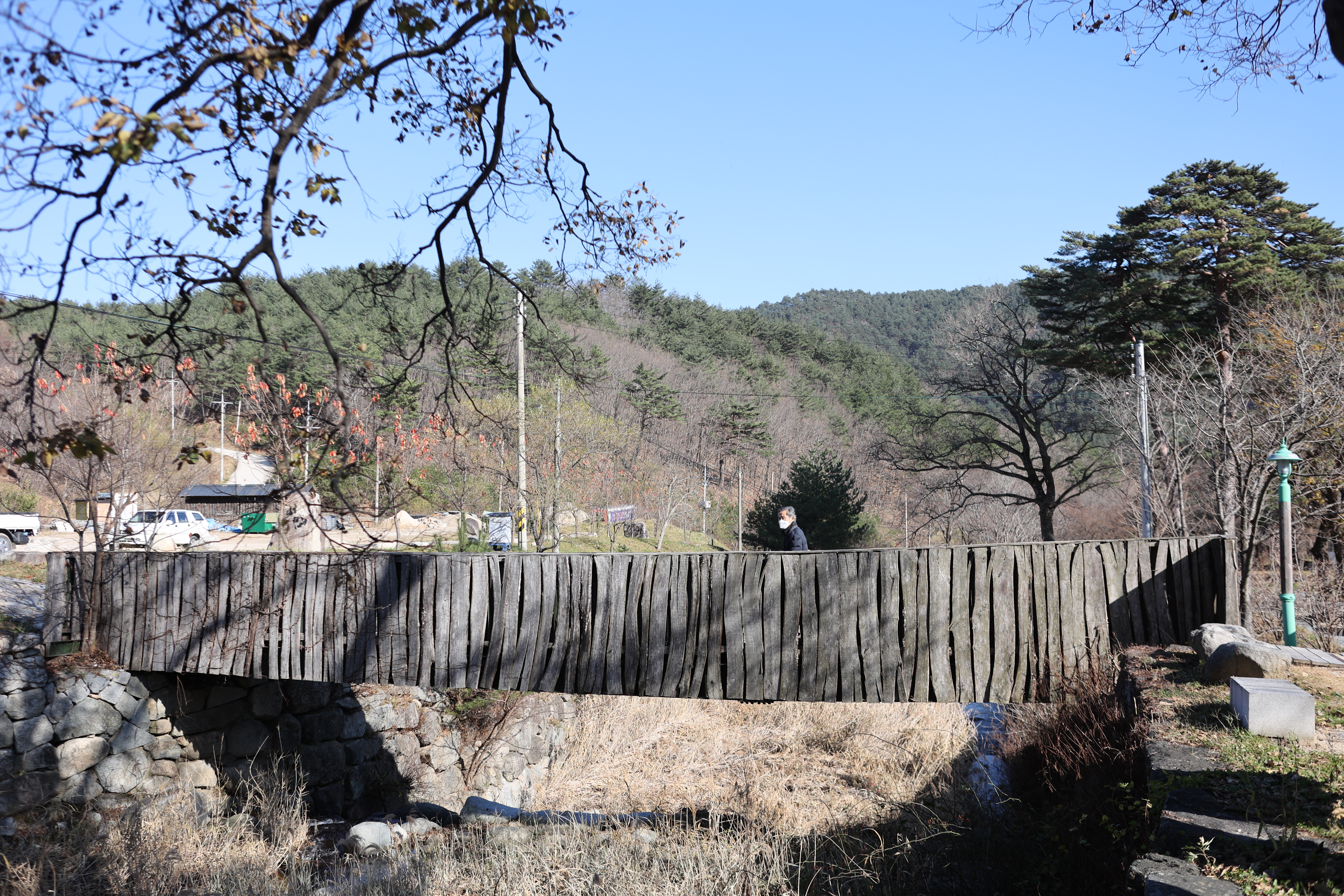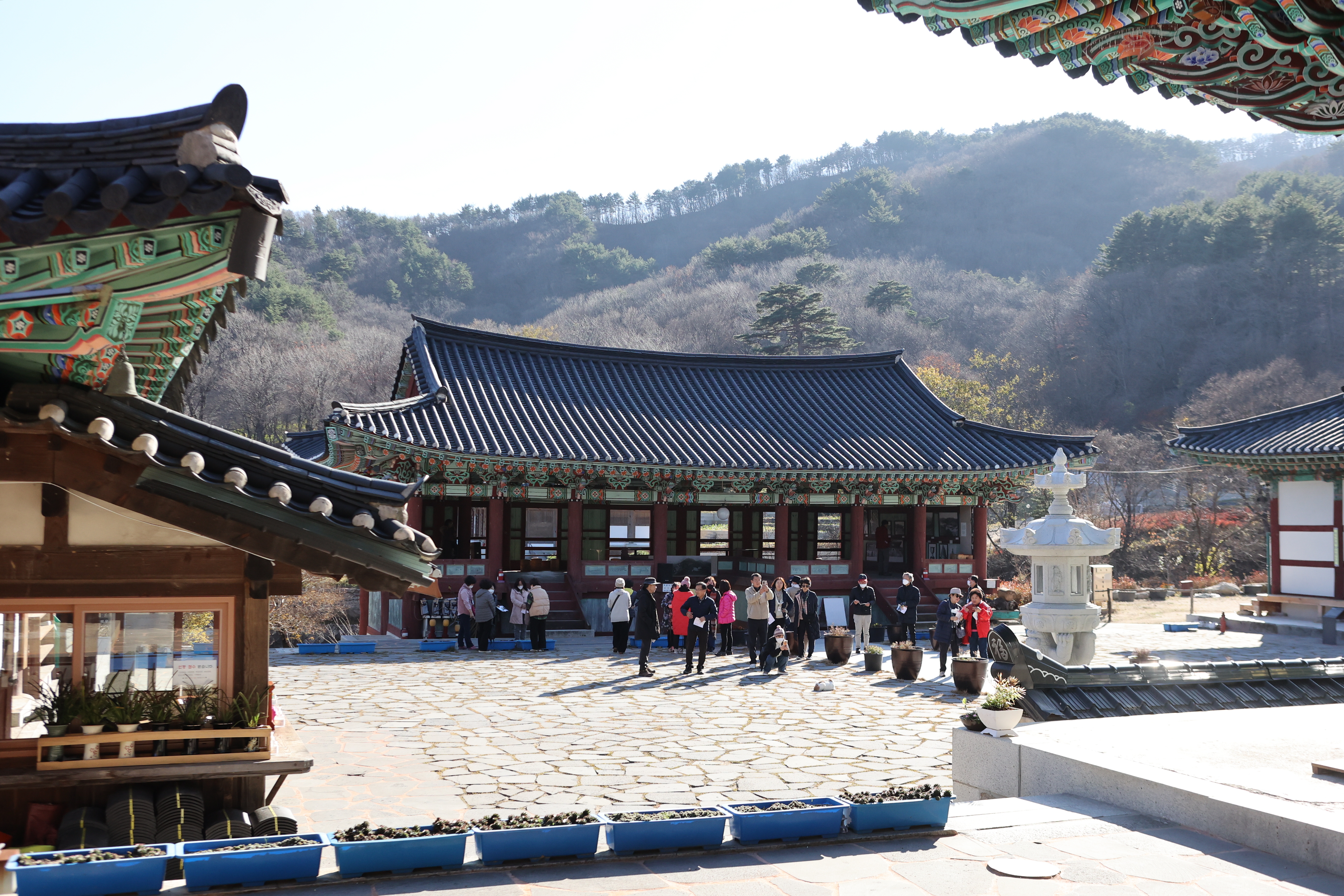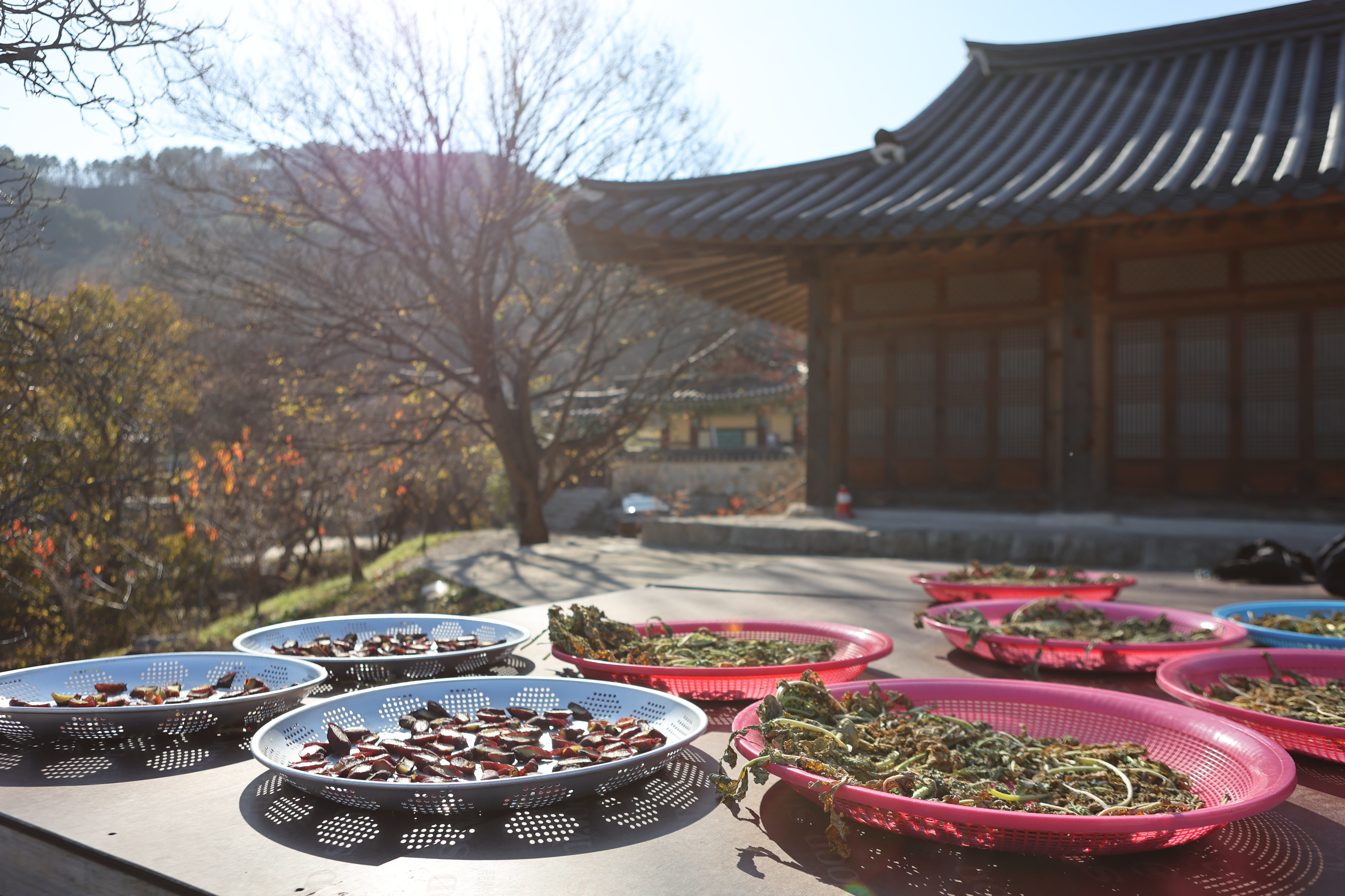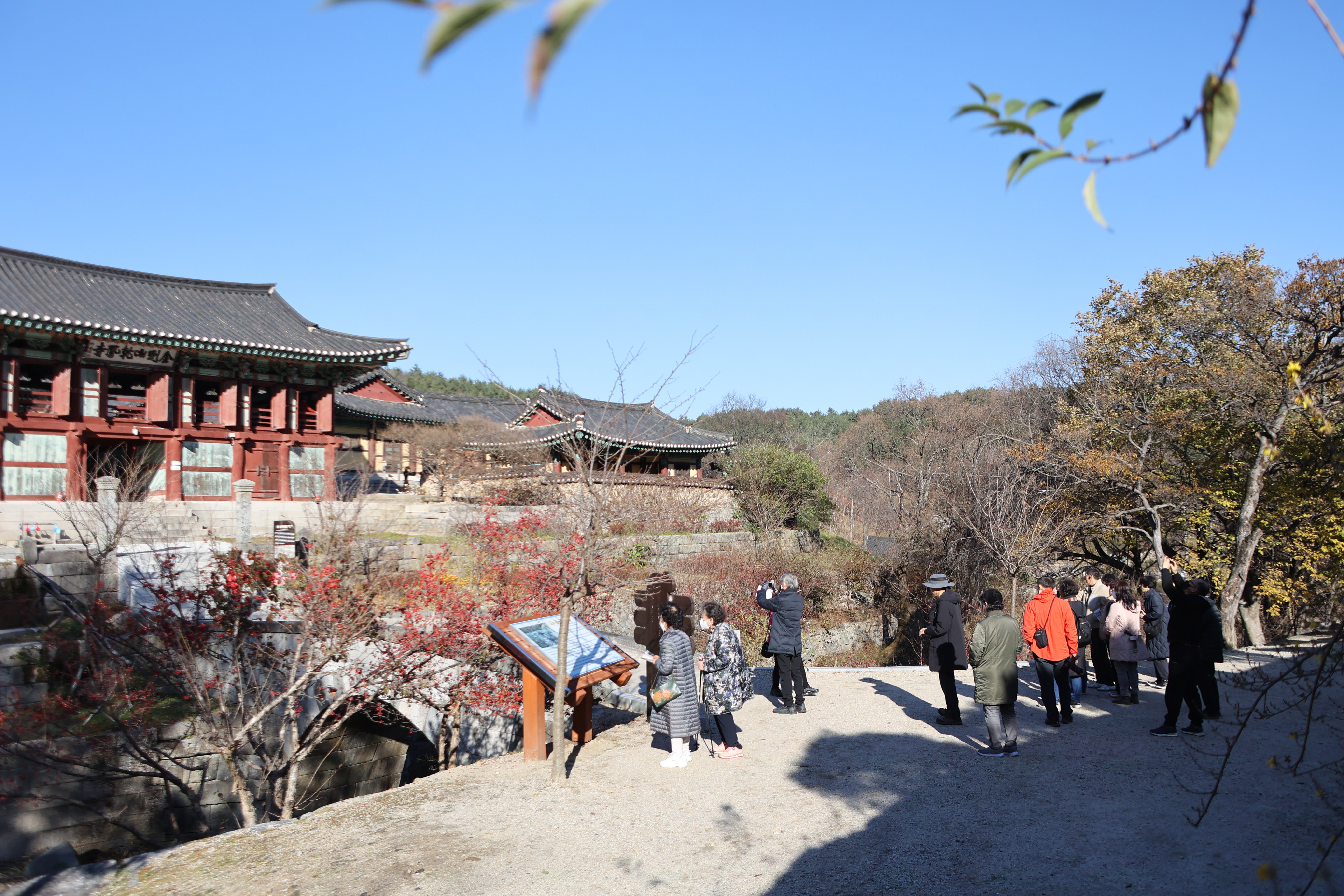 금강산도 식후경이라 했던가. 목교인 연화교가 참 인상적이다 이거 영화의 한 장면에 삽입될만한데 하면서 출렁다리 지나듯 지난 까닭은 이미 점심이 약속되어 있는 공양간으로 가기 위해서다. 나물 20여 가지가 뷔페식으로 진열되어 있다. 오랜만에 접하는 사찰음식이 머리를 맑게 하고 몸을 경건하게 해주는 느낌이다. 뒤꼍엔 마지막 단풍이 골바람에 몸을 맡겼다.