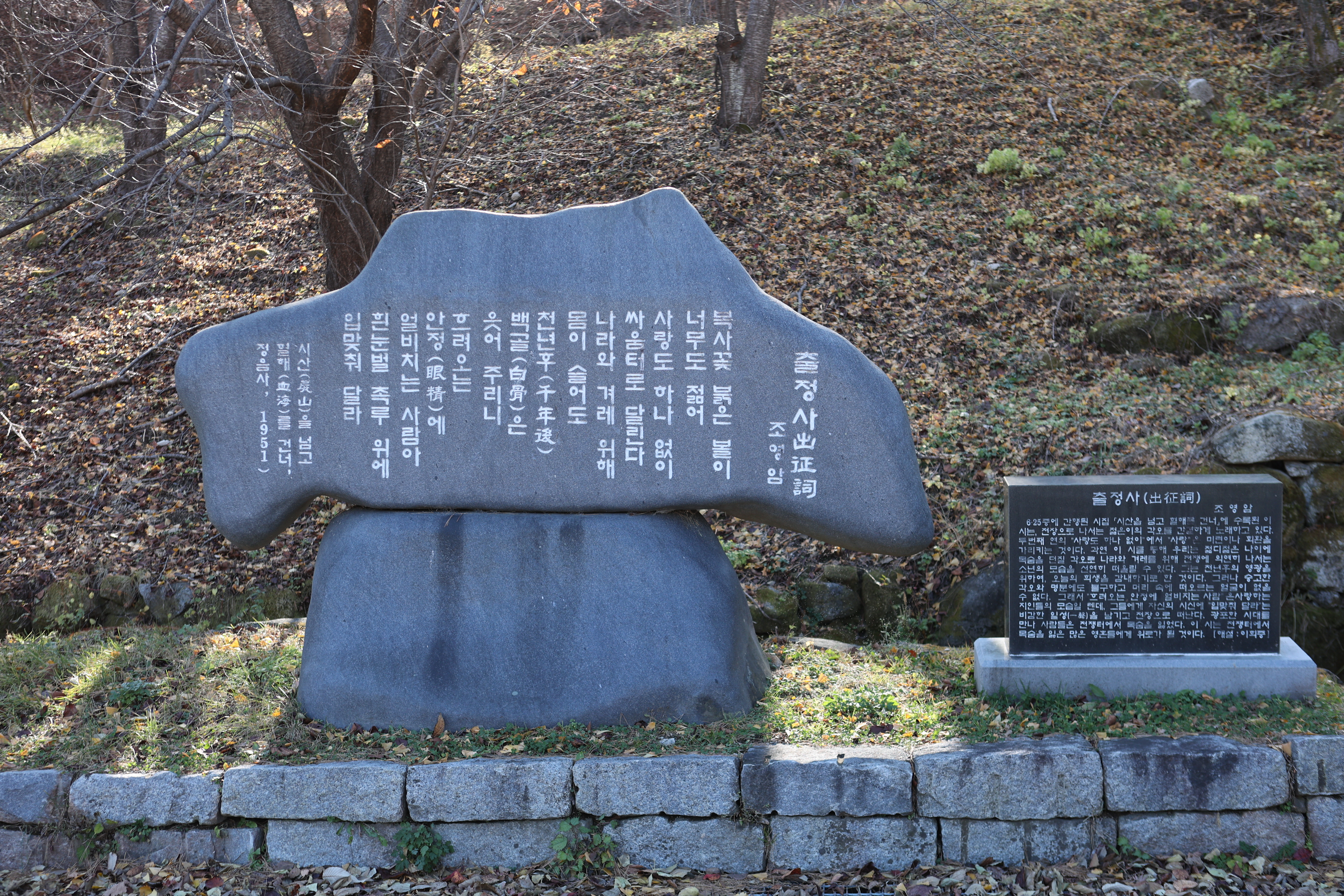 더 흥미로운 것은 금강산 비로봉 아래 출생한 조영암은 같은 해에 월남하여 종군기자를 지내기도 하고, 전쟁터로 나가는 절은이들을 향해 출정사(出征詞) 시를 썼다는 것이다. [문인에세이] 건봉사의 슬픈 가을 < 분류안됨 < 기사본문 - 불교신문 (ibulgyo.com)