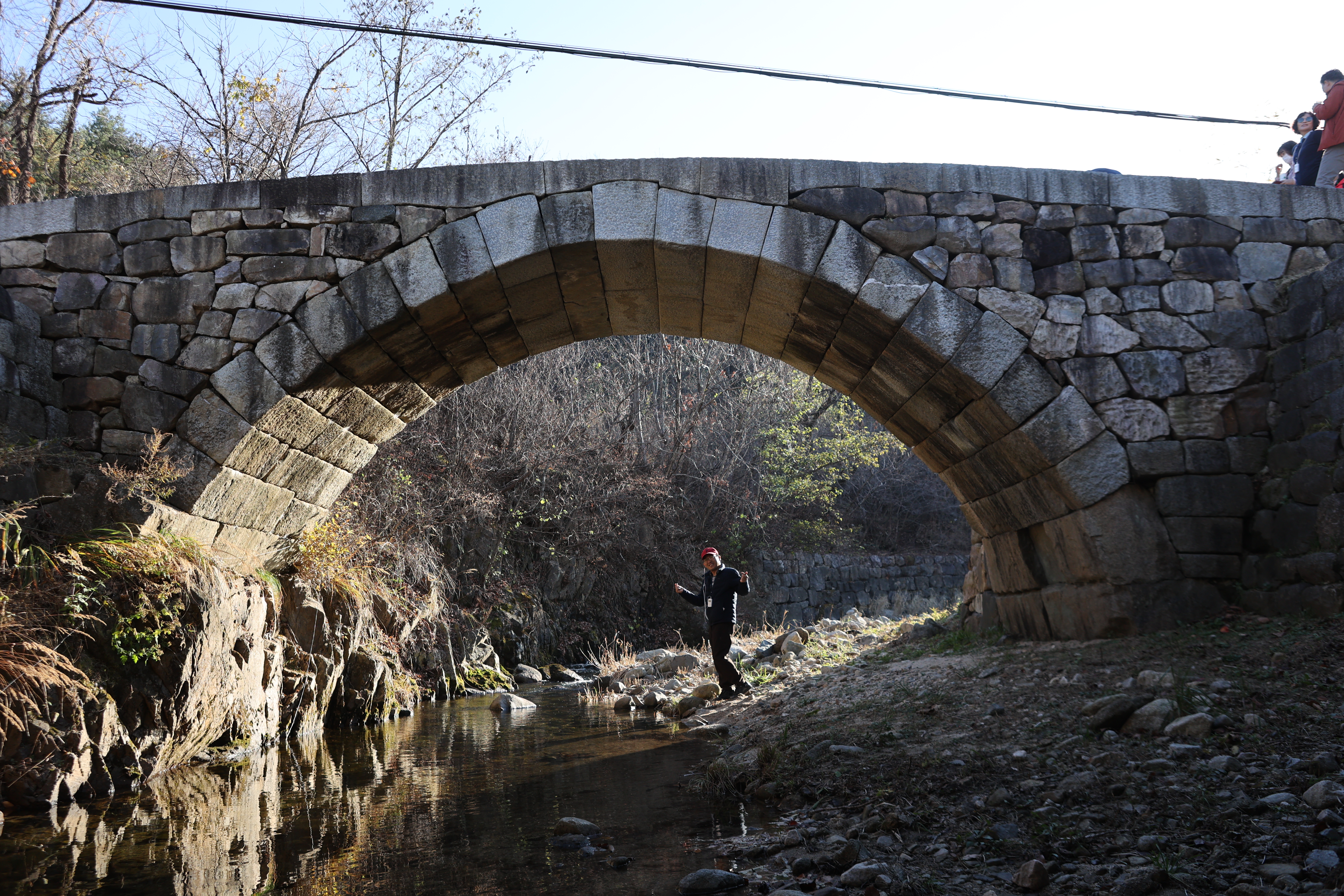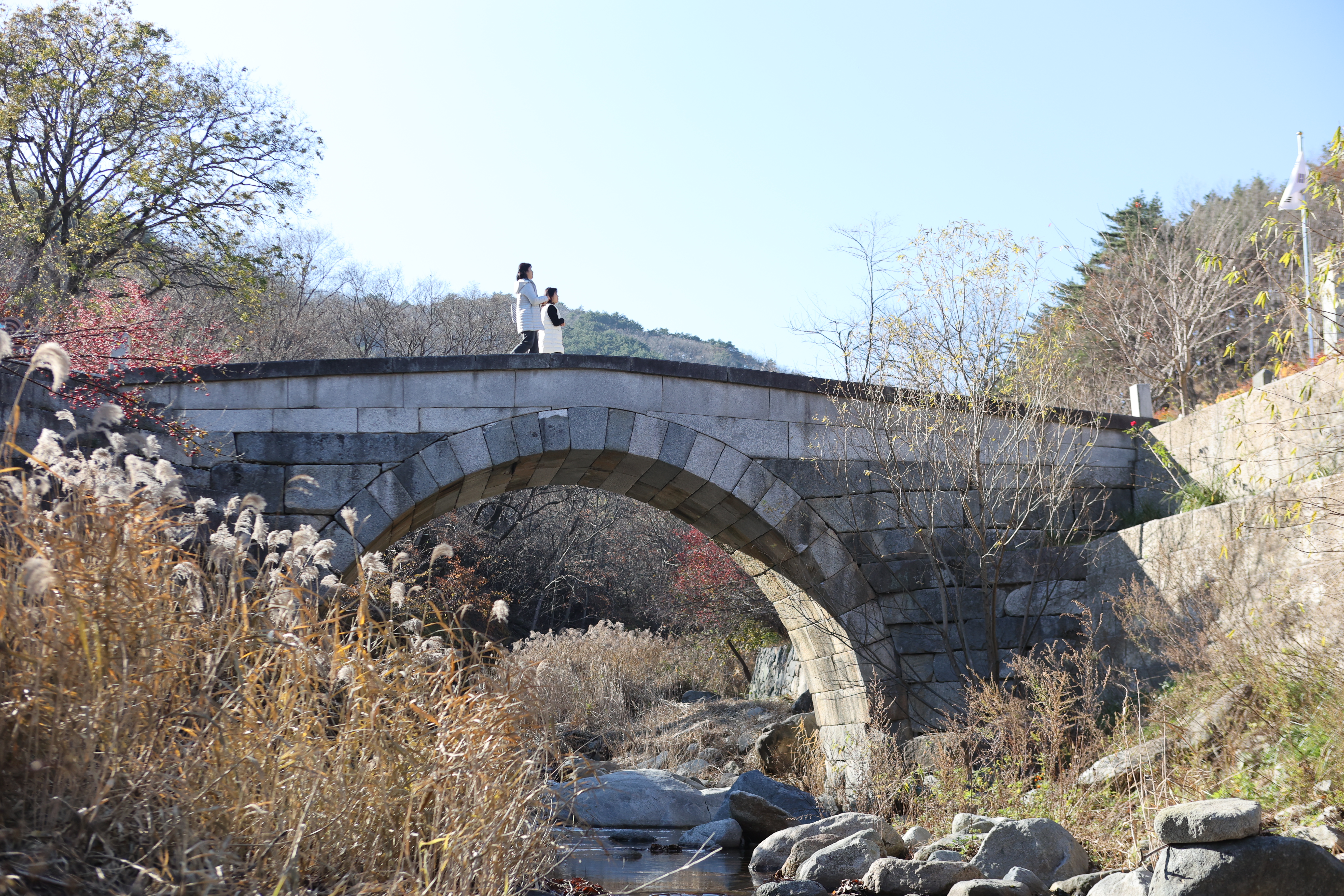 고성 육송정 홍교(六松亭 虹橋). 일명 백운교. 보물 제1337호. 건립연대는 정확히 알 수 없으나 고성 건봉사 능파교(보물 1336호)와 함께 1745년(영조 21)의 대홍수로 붕괴되었는데 1704(숙종30)에 축조된 능파교와 비슷한 시기에 세워진 것으로 추정된다. 1748년에 편찬된 《간성군읍지(杆城郡邑誌)》에 육송정 홍교가 언제 만들었는지 알 수 없다고 기록되어 있다. 하천의 폭이 12m 정도 되는 곳에 석축을 쌓고, 길이 10.6m의 다리를 놓았다. 홍예의 기초는 자연지형을 활용하였는데, 동쪽은 높이 1.7m 암반을 그대로 이용하여 그 위에 홍예돌과 비슷한 크기의 장대석으로 높이 30㎝인 1단의 지대석을 두었다. 서쪽에서는 3단의 지대석을 쌓은 뒤 그 위에 홍예를 올렸는데, 1단에 2개씩의 장대석을 이어서 만들었다.