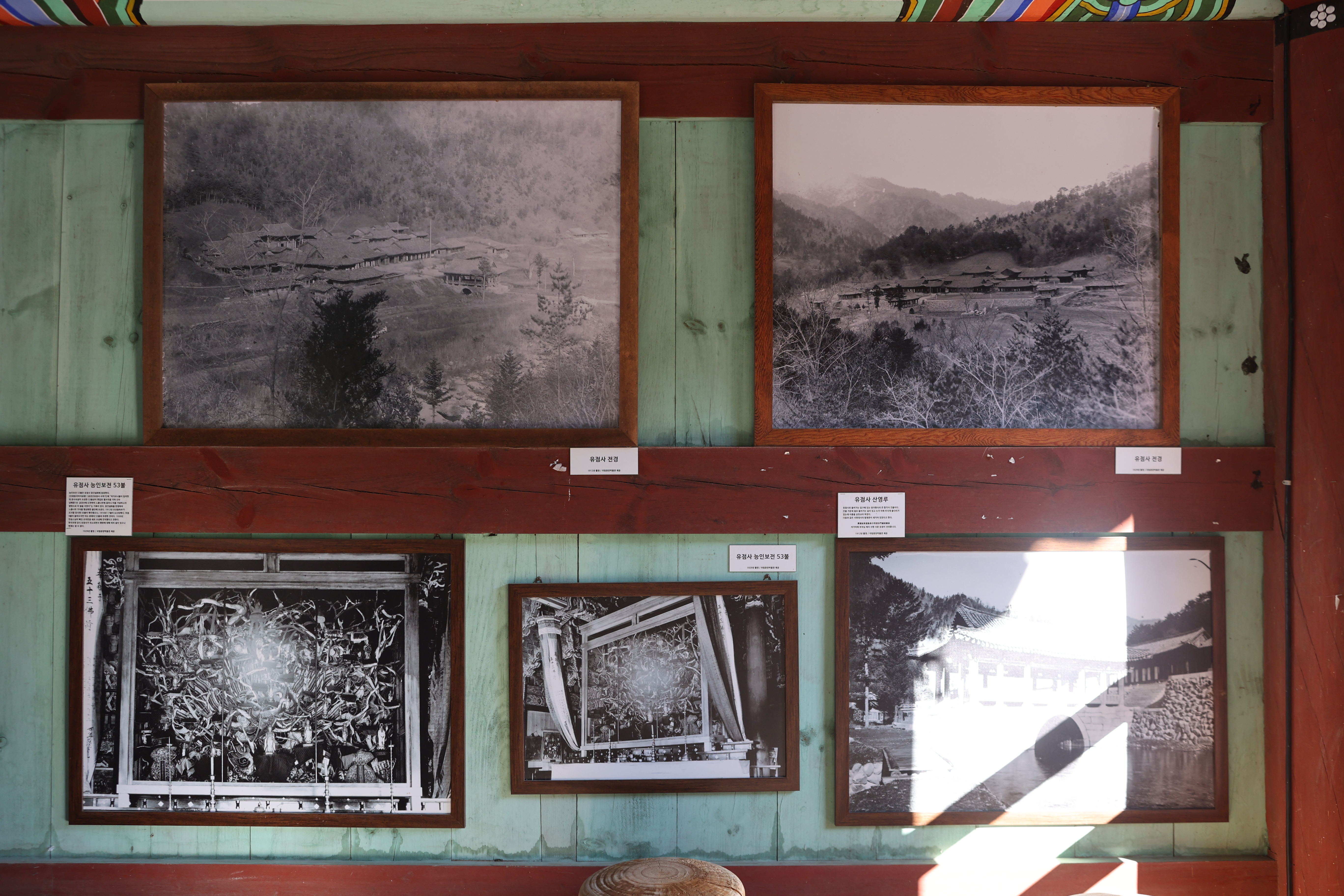 건봉사 봉서루에 전시되어 있는 옛사진. (상)유점사 전경 2점, (하)좌로부터 유점사 능인보전, 유점사 산영루 사진.