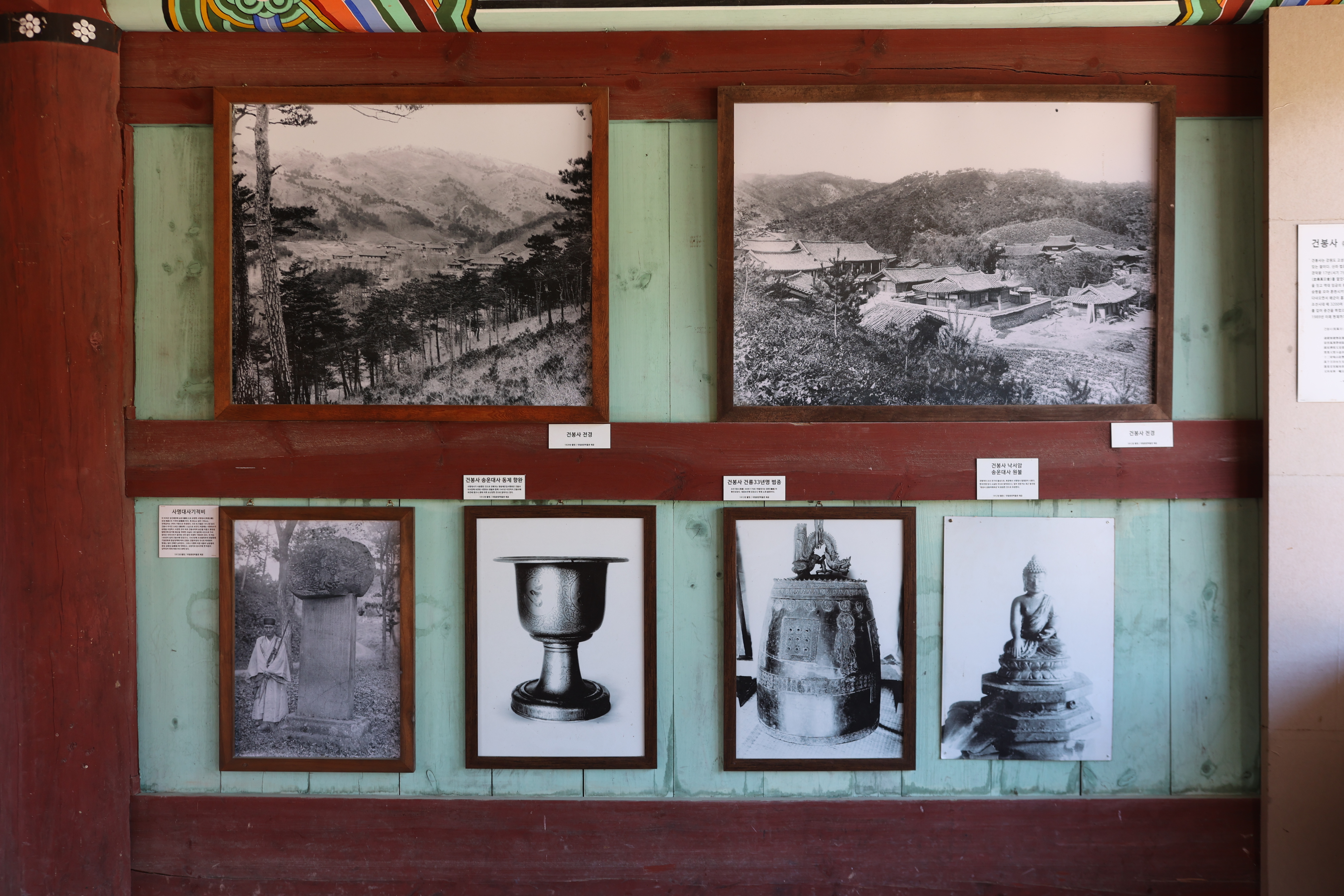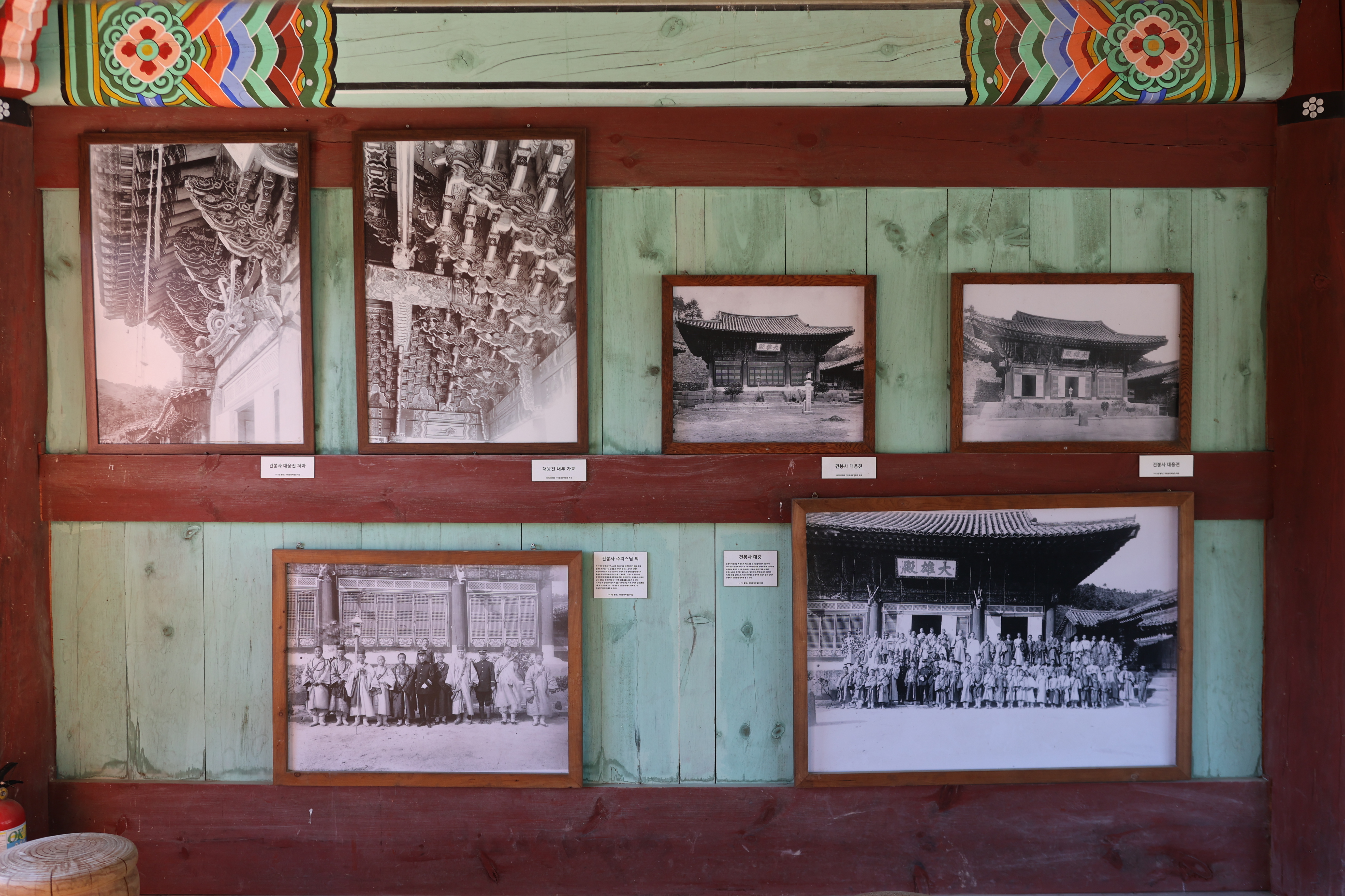 건봉사 봉서루에 전시되어 있는 옛사진. (상)좌로부터 건봉사 대웅전 처마. 내부 가교, 대웅전 2점. (하) 좌로부터 건봉사 주지스님 외. 건봉사 대중 사진.