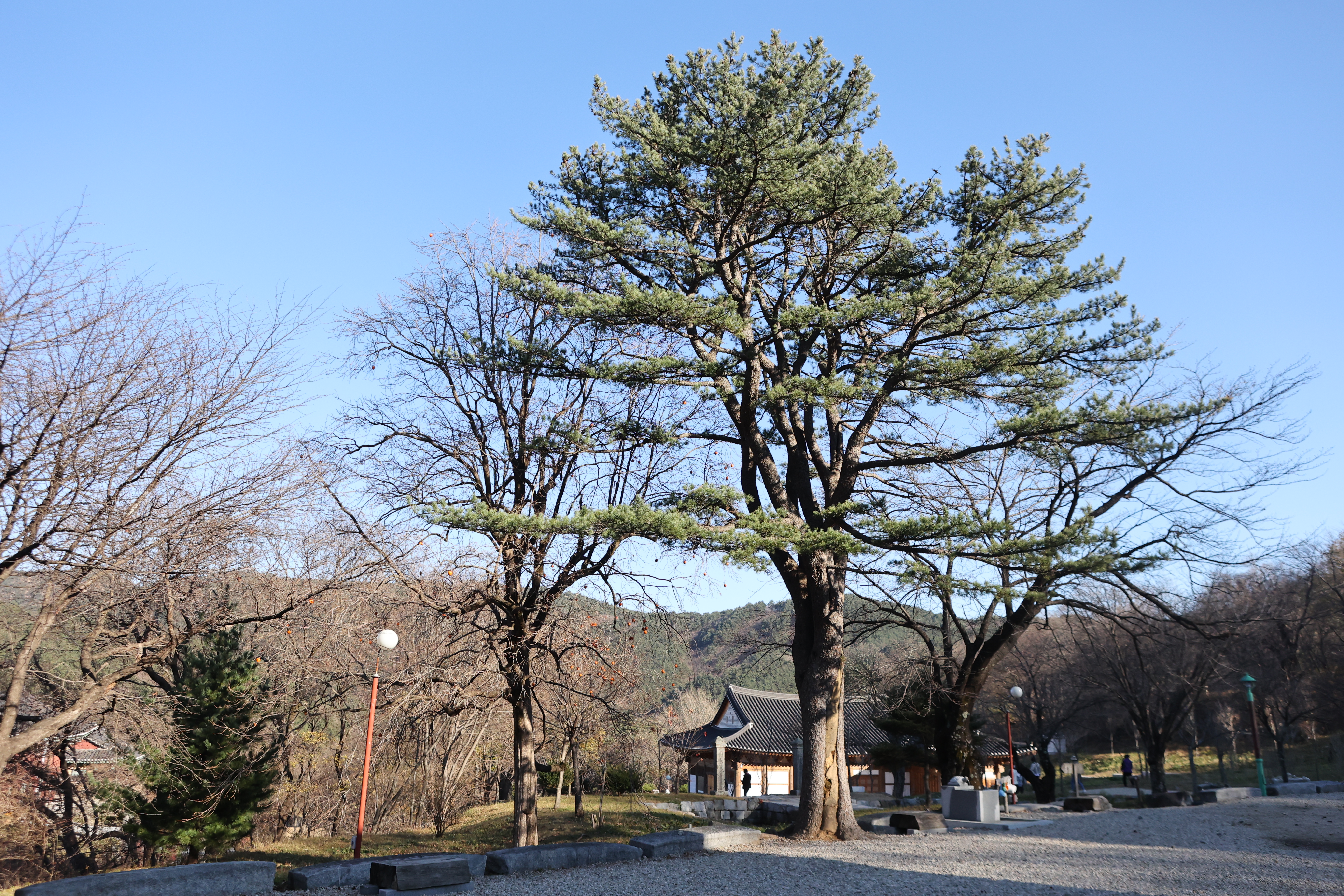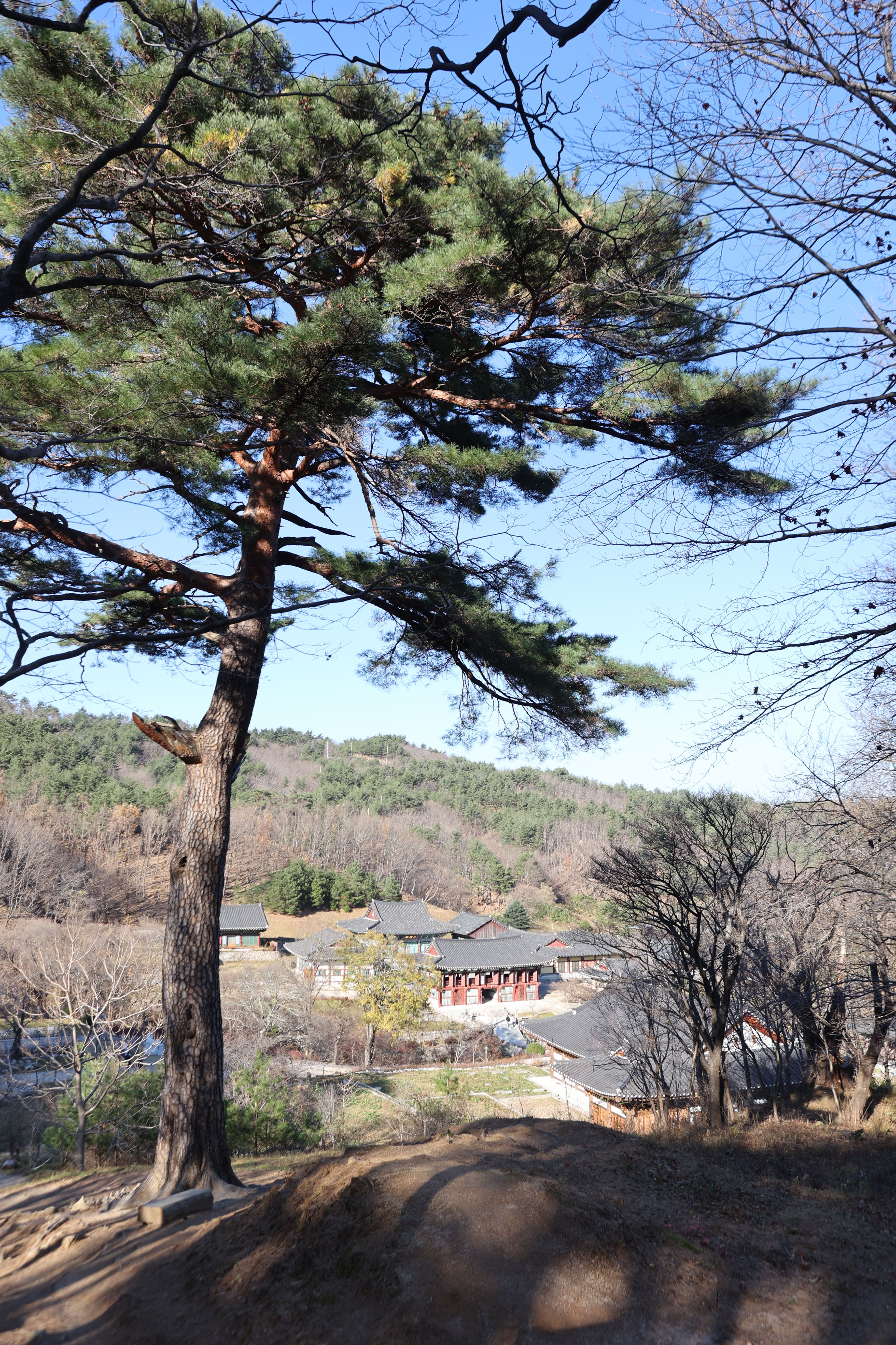 극락전에서 적멸보궁을 오르다보면 왼편에 장대한 소나무 하나 서 있다. 그 기개가 엄청난데 건봉사가 자랑하는 왕소나무다. 솔보굿(소나무 줄기의 비늘 같은 껍질)이 2백년 묵은 거북의 등짝처럼 임란 때 장군의 갑옷처럼 장엄한 느낌임에도 아직 보호수로 지정받지는 못하였다. 여기서 건봉사 전경이 나무들 사이를 비집고 한 눈에 들어온다.
