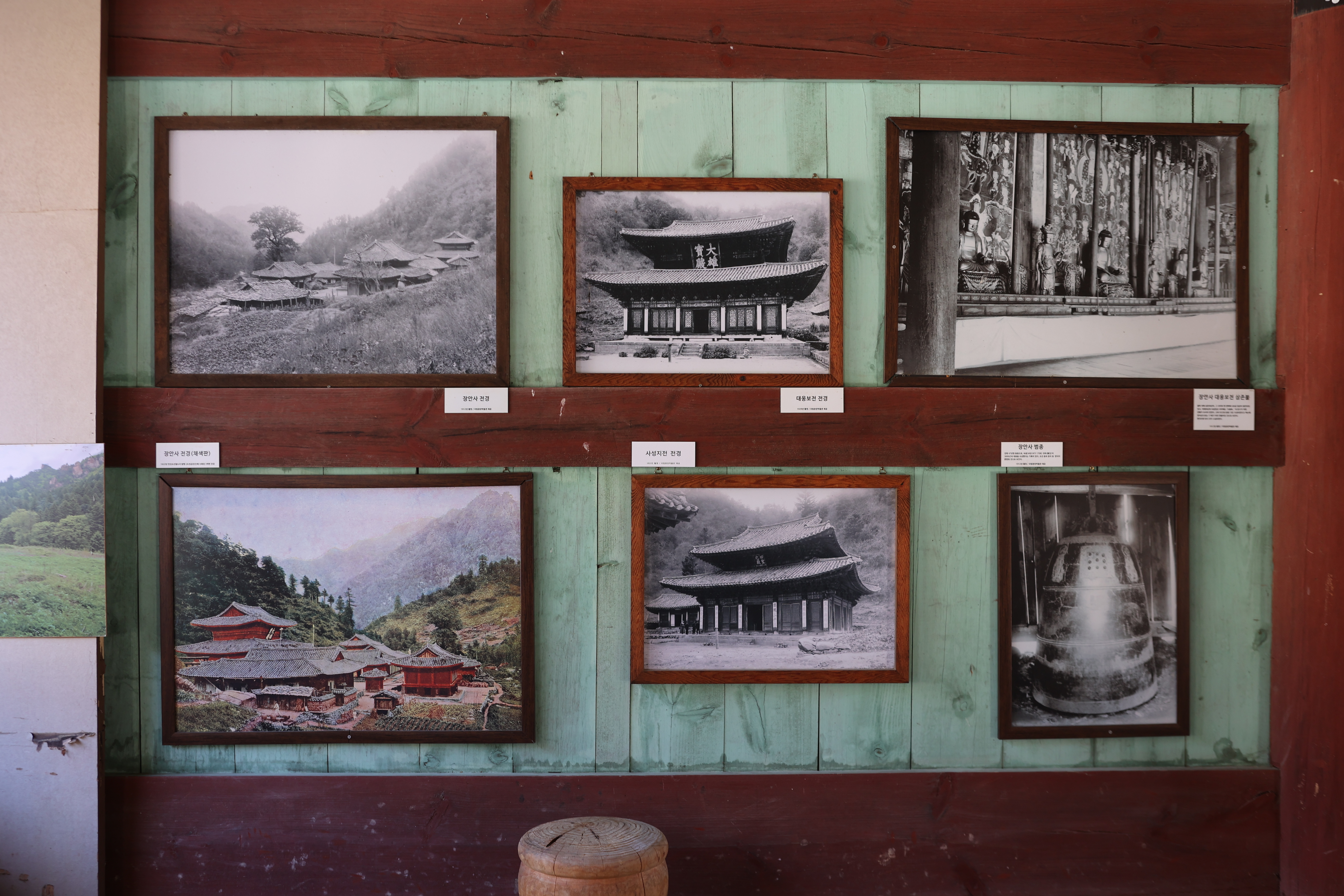 건봉사 봉서루에 전시되어 있는 옛사진. (상)좌로부터 장안사 전경, 대웅보전, 대웅보전삼존불. (하)좌로부터 장안사 전경, 사성지전, 범종 사진.